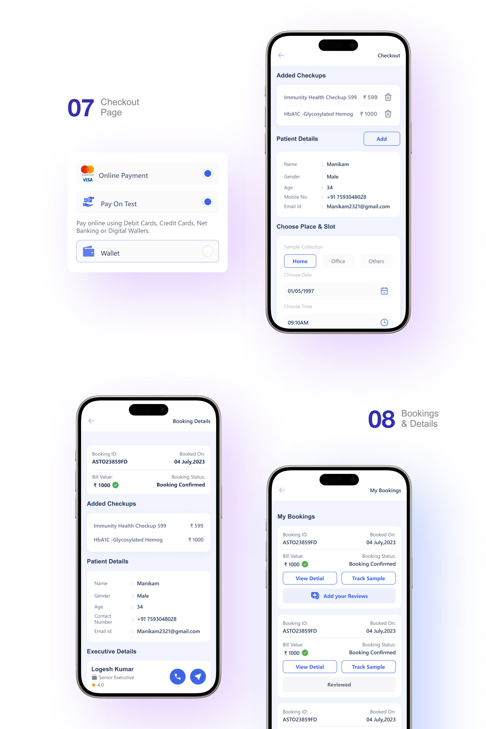 Detailed booking information: Users can review detailed information about their bookings, including the selected tests, appointment date and time, and any other relevant details. This section acts as a reference point for users to double-check the accuracy of their bookings.